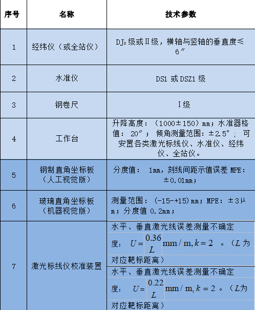 激光標線儀校準裝置主要技術參數如表 1 所示,校準方式分為機器視覺和人工視覺兩種方法,表格中淺藍色部分為兩種校準方式共用的儀器和技術參數。