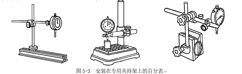 2  使用百分表或千分表時,必須把它固定在可靠的夾持架上(如固定在萬能表架或磁性表座上,圖5-3所示),夾持架要安放平穩,免使測量結果不準確或摔壞百分表。