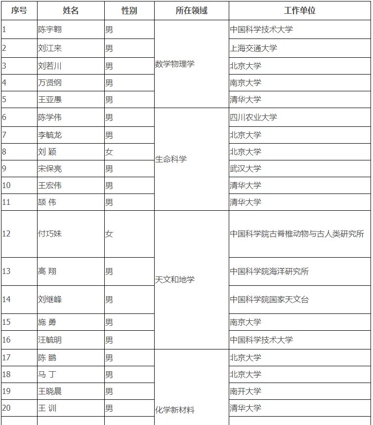 根據(jù)名單我們可發(fā)現(xiàn),此次獲獎(jiǎng)?wù)呓^大多數(shù)來自17所高校,如北京大學(xué)、清華大學(xué)、上海交通大學(xué)、浙江大學(xué)、中科大、南京大學(xué)、武漢大學(xué)、華中科技大學(xué)、東南大學(xué)、廈門大學(xué)、西南交通大學(xué)等;9名獲獎(jiǎng)?wù)邅碜韵嚓P(guān)研究所,還有一名來自中國石油化工股份有限公司。