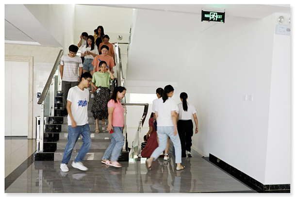 下午5點40分,火災警鈴發出警報聲,全體員工快速、有序、安全進行疏散,向引導人員指定的方向撤離。所有人員疏散到樓下空地后,消防宣傳員李老師給大家普及火災逃生知識,現場講解滅火器使用方法,指導員工親身體驗使用滅火工具。