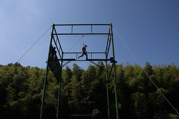 “高空斷橋”。隊員將爬上一個8米高的斷橋,從一端跳到另一端并返回。