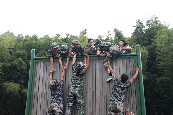 “畢業墻”。所有隊員在團隊協作攀登4.27米的高墻。