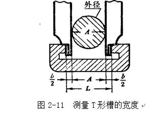 用游標卡尺測量T形槽的寬度,如圖2-11所示。測量時將量爪外緣端面的小平面,貼在零件凹槽的平面上,用固定螺釘把微動裝置固定,轉動調節螺母,使量爪的外測量面輕輕地與T形槽表面接觸,并放正兩量爪的位置 (可以輕輕地擺動一個量爪,找到槽寬的垂直位置),讀出游標卡尺的讀數圖2-11中用A表示。但由于它是用量爪的外測量面測量內尺寸的,卡尺上所讀出的讀數A是量爪內測量面之間的距離,因此必須加上兩個量爪的厚度b,才是T形槽的寬度。所以,T形槽的寬度L=A+b。